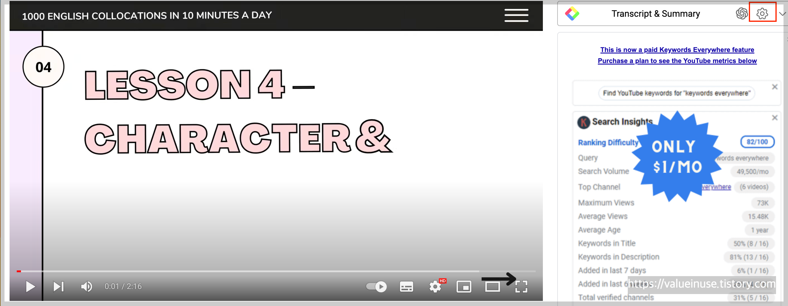 설치한 후 유튜브 영상을 재생하면 오른쪽에 "스크립트, 서머리"가 보입니다. 설정을 클릭하세요