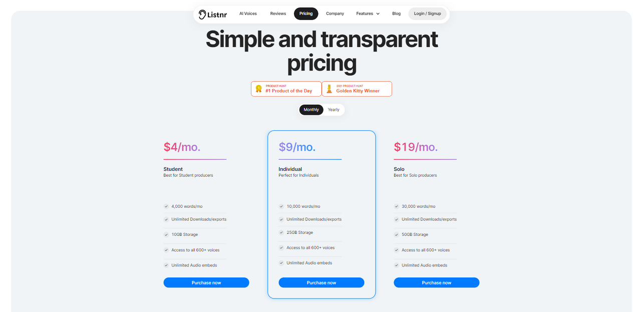 Listnr은 여러 언어에 대한 철저한 지원과 고유한 음성을 활용하는 기능으로 목록에 있는 다른 텍스트 음성 변환 응용 프로그램과 차별화됩니다. 모든 기능에 대해 매우 합리적인 가격입니다.