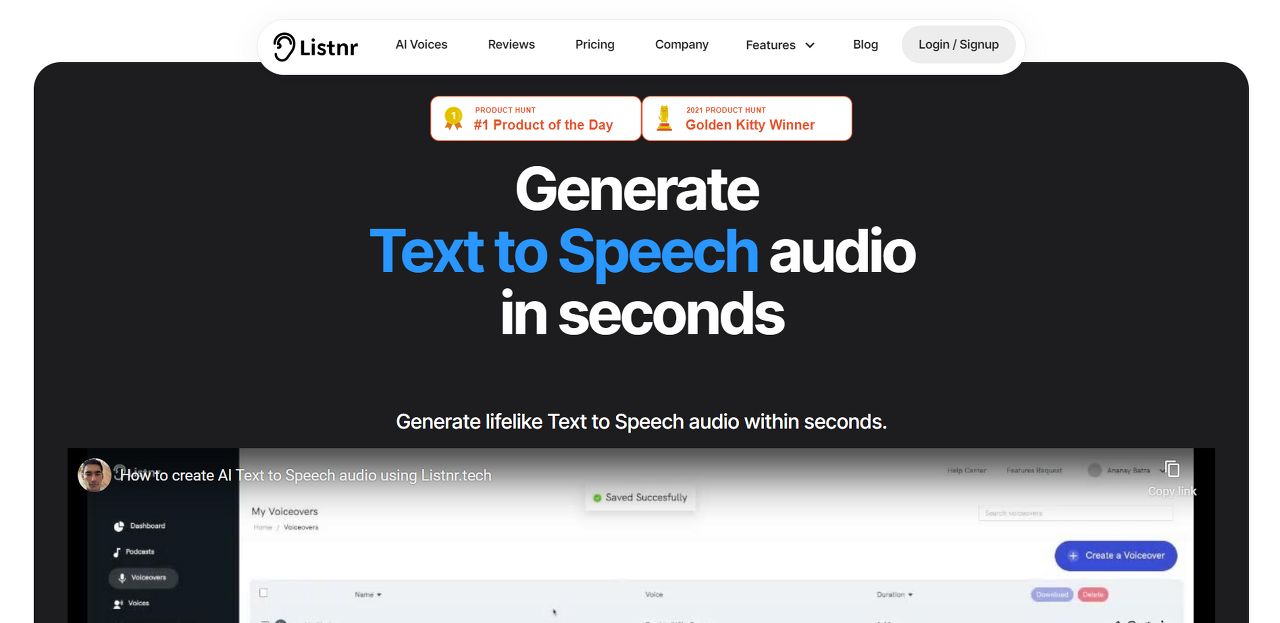 Listnr은 인공 지능(AI) 및 딥 러닝 알고리즘이 지원하는 최첨단 음성 합성 기술을 사용하여 텍스트에서 가장 인간적인 소리를 복제하는 텍스트 음성 변환 플랫폼입니다.