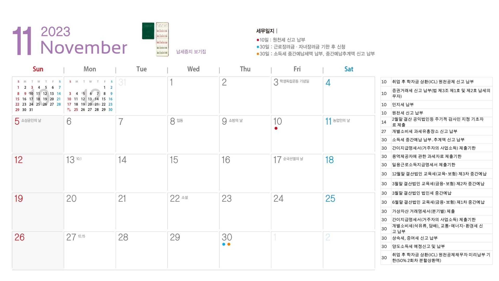 | 11 | 30 | 소득세 중간예납 납부․추계액 신고 납부 | 2023년 1월~6월분 |