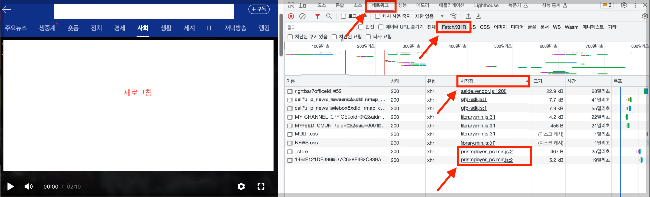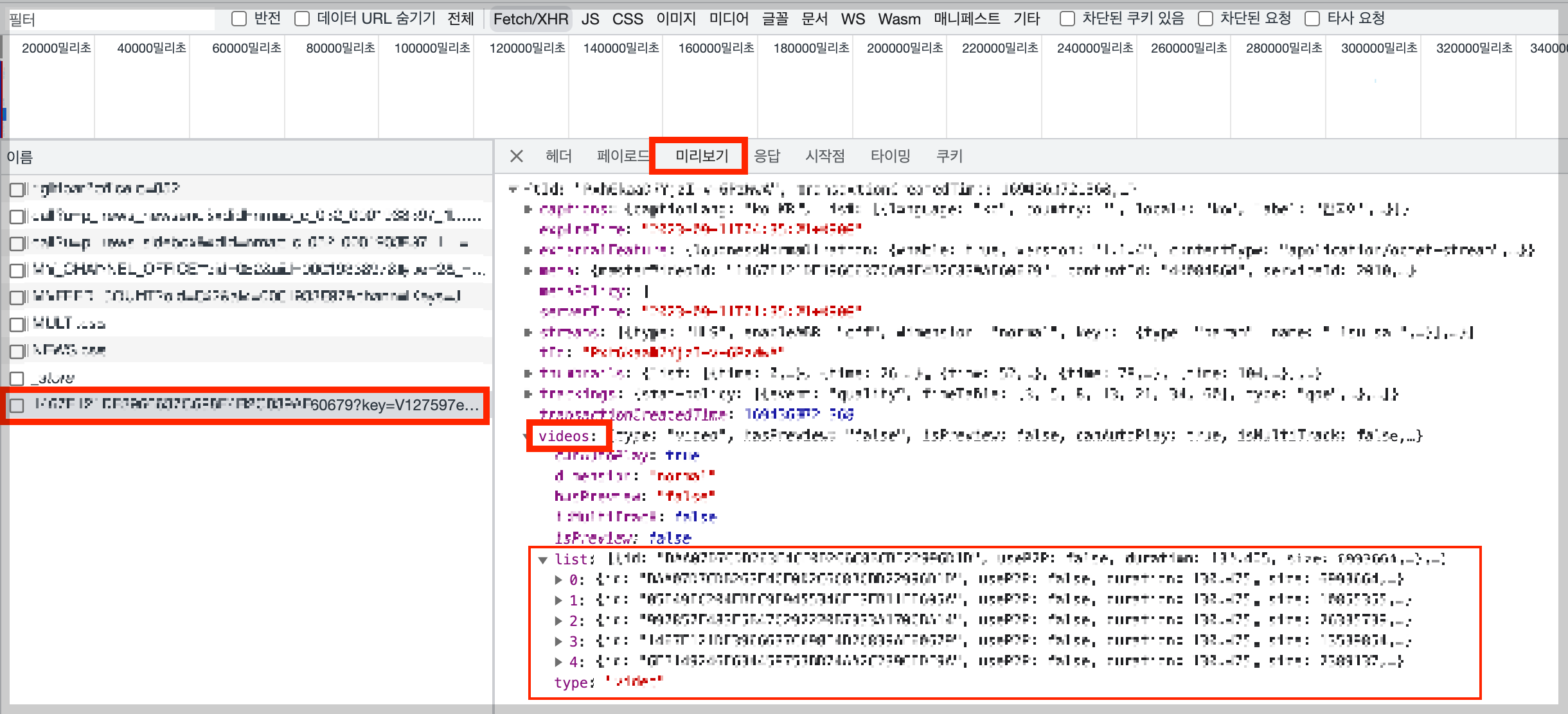 영상을 play 한 상태에서 개발자 도구 클릭 → 네트워크 → 동영상페이지 새로고침 → Fetch/XHR 에서 player 가 담긴 곳을 클릭