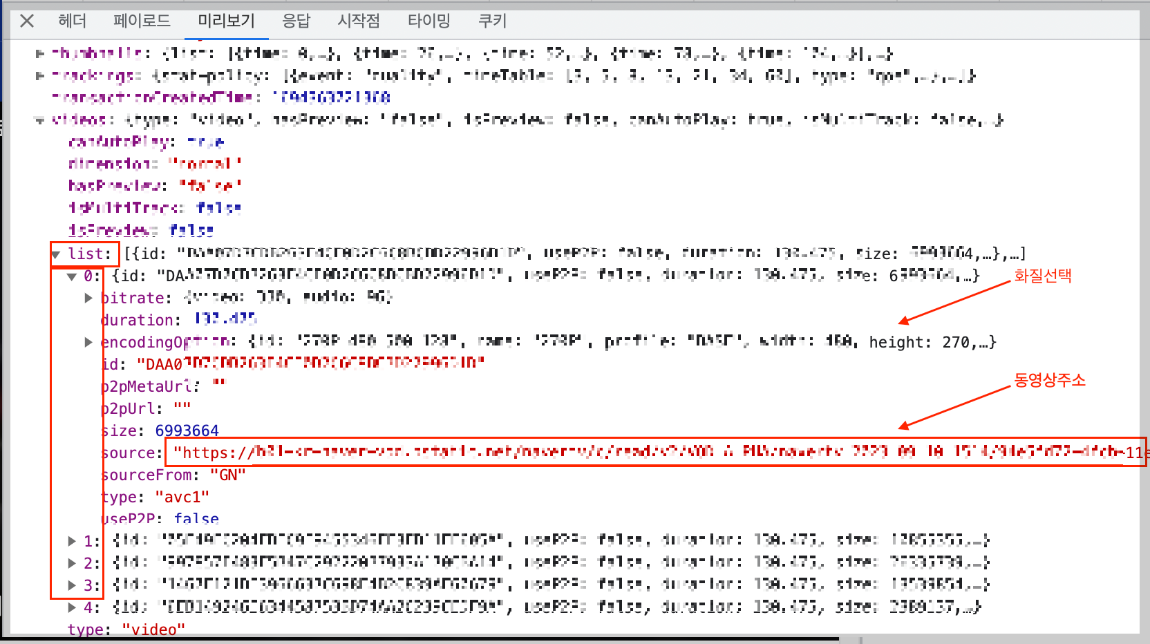 → 비디오 → list 안에 해상도 별로 4개 정도의 id 생성