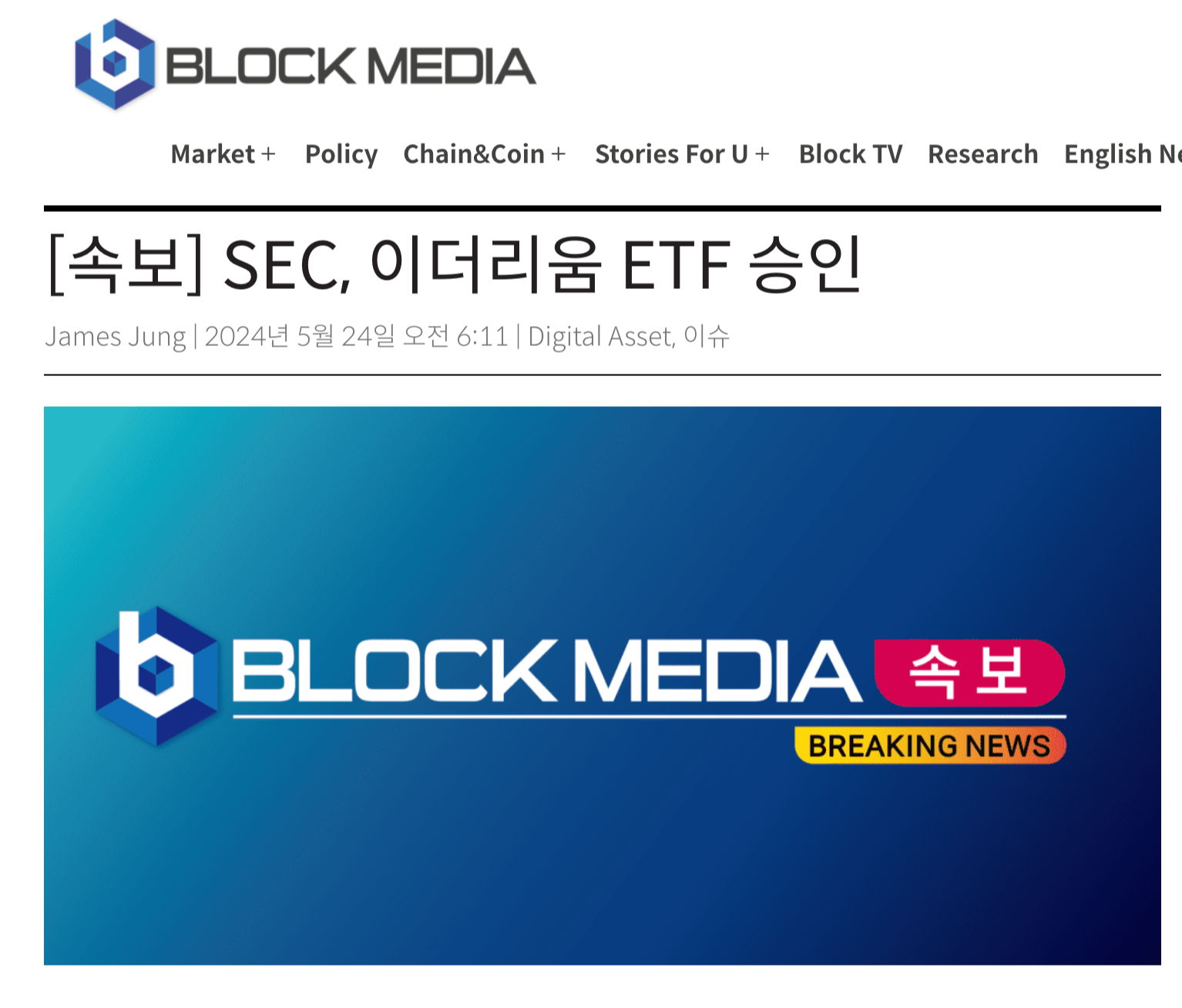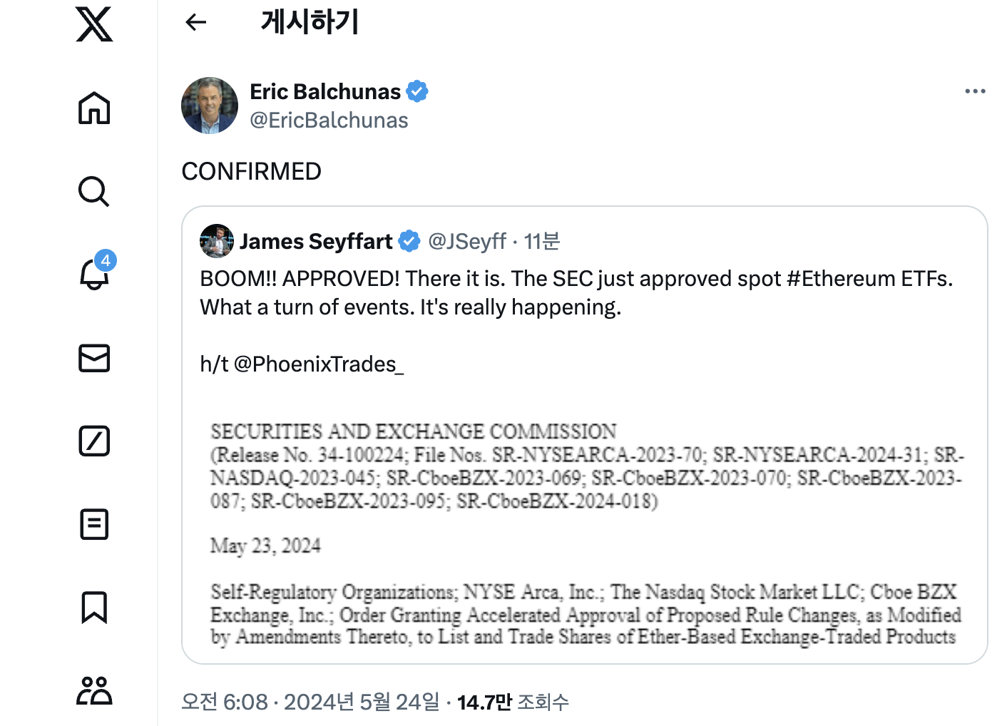 미국 증권거래위원회(SEC)가 이더리움 현물 ETF를 승인했다고 23일(현지 시간) 블룸버그 인텔리전스 분석가들이 엑스에 트윗한 내용입니다.