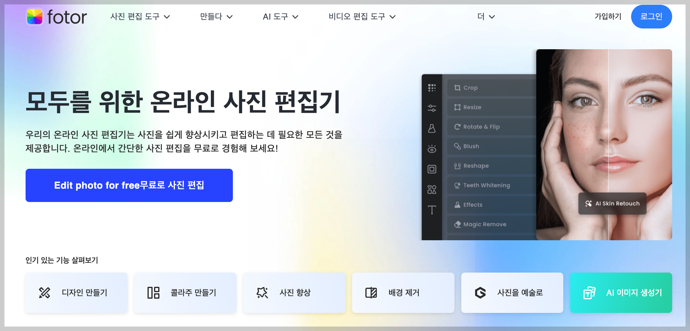 - 설명: Fotor는 온라인 이미지 편집기이며, 사용하기 쉬운 인터페이스와 다양한 필터, 효과를 제공합니다.