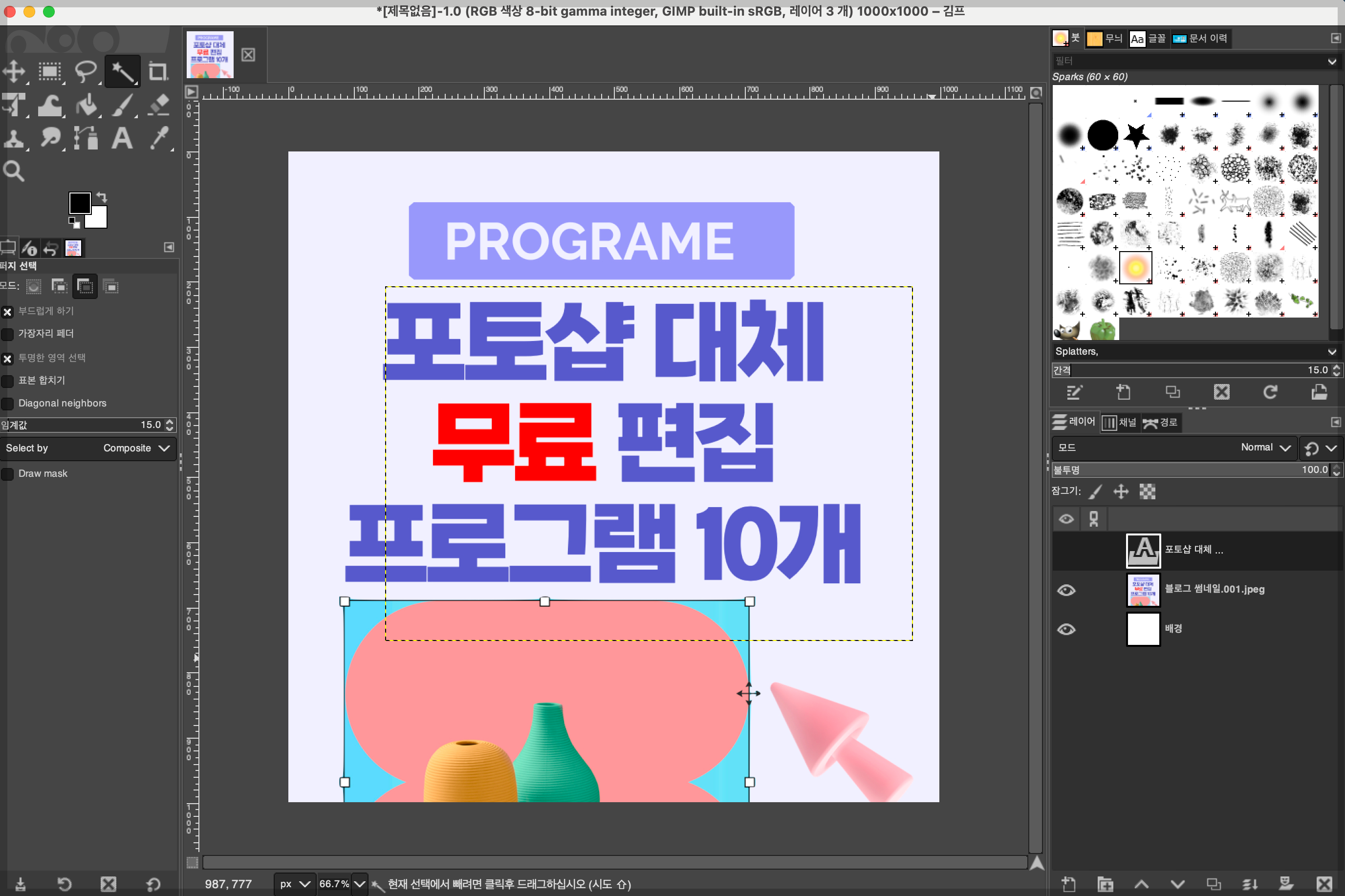 - 설명: GIMP는 가장 유명한 무료 이미지 편집 프로그램 중 하나입니다. 포토샵과 유사한 기능을 제공하며, 레이어, 필터, 마스크 등 다양한 고급 도구를 지원합니다.
