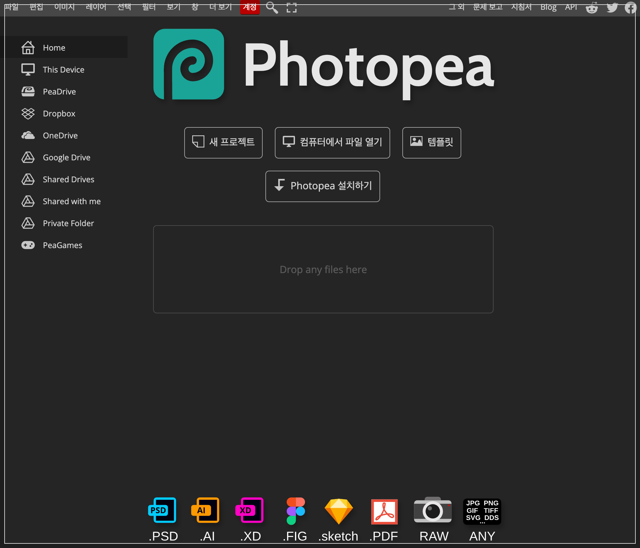 - 설명: Photopea는 웹 기반 이미지 편집기입니다. 포토샵과 유사한 인터페이스와 기능을 제공하며, 브라우저에서 직접 실행할 수 있습니다.