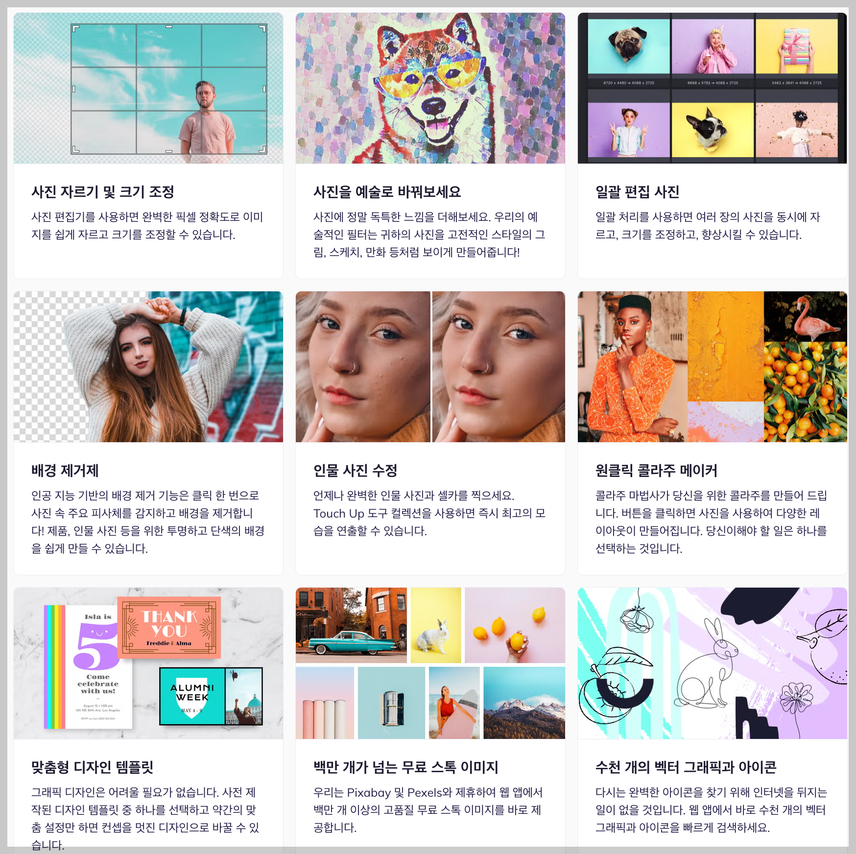 - 사용방법: 웹사이트에 접속하여 이미지를 업로드한 후, 다양한 편집 도구와 템플릿을 사용해 이미지를 편집하거나 콜라주를 만들 수 있습니다.