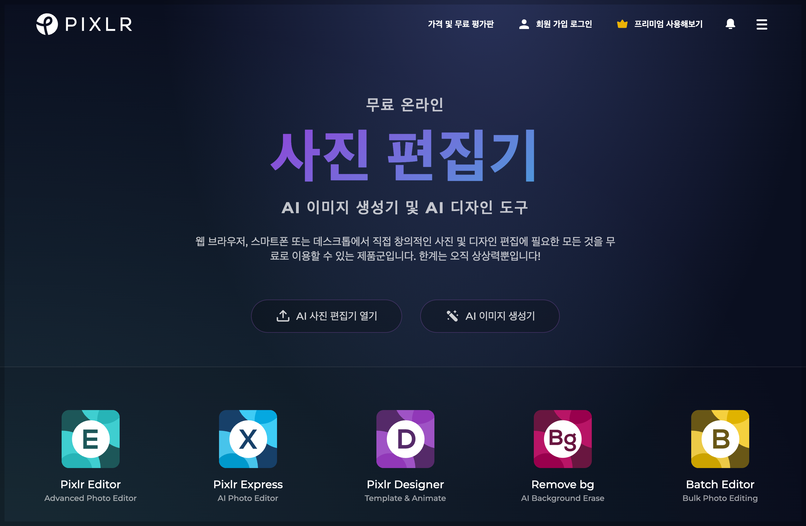 - 설명: Pixlr X는 온라인 이미지 편집기입니다. 사용하기 쉬운 인터페이스와 다양한 편집 도구를 제공합니다.